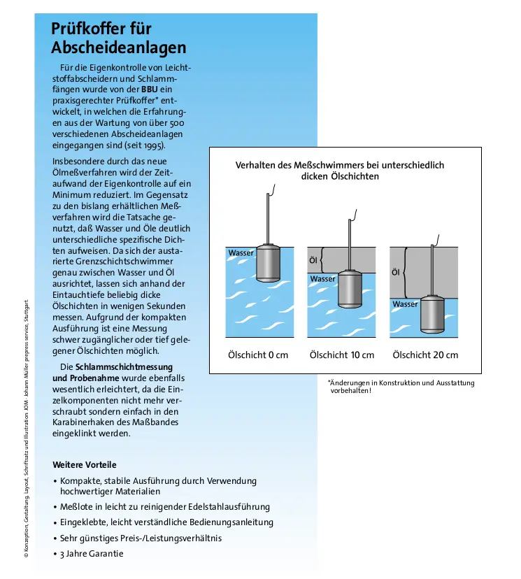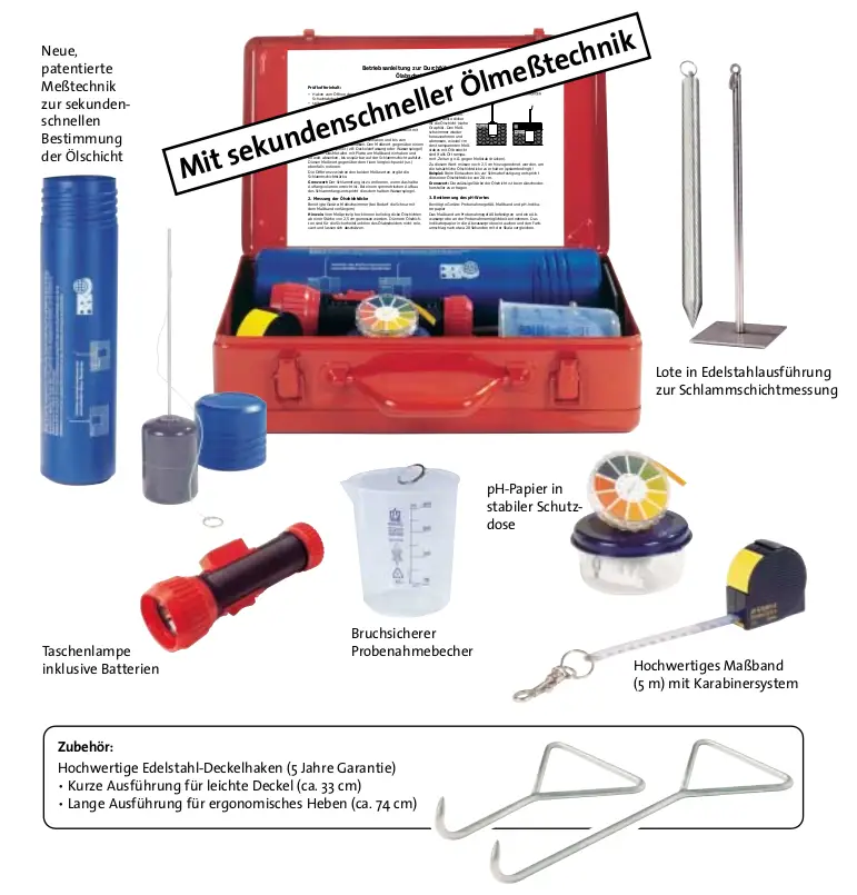 Betreiber von Leichtstoffabscheidern (Koaleszenzabscheider bzw. Ölabscheider) haben die Pflicht zur monatlichen Eigenkontrolle sowie halbjährlichen Wartung gemäß DIN 1999-100. Wesentlicher Teil der Kontrollen ist die monatliche Messung der neue, patentierte Meßtechnik zur sekundenschnellen Bestimmung der Ölschicht Schlamm- und Ölschicht mit Eintragung der Ergebnisse in ein Abwasser betriebstagebuch. Regelmäßige Messungen sind nicht nur aus Gründen der Rechtssicherheit dringend zu empfehlen, sondern sie helfen auch dabei, die Kosten beim Abscheiderbetrieb zu optimieren. Beispiele hierfür sind die Abscheiderleerung nach dem tatsächlichem Bedarf, die Verhinderung eines Abwasserrückstaus mit allen Folgeproblemen sowie die Prüfung der Abrechnung bei einer Abscheiderleerung.